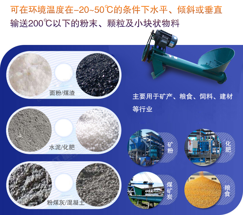 可在環(huán)境溫度在-20~50℃的條件下水平、傾斜或垂直輸送200℃以下的粉末、顆粒及小塊狀物料