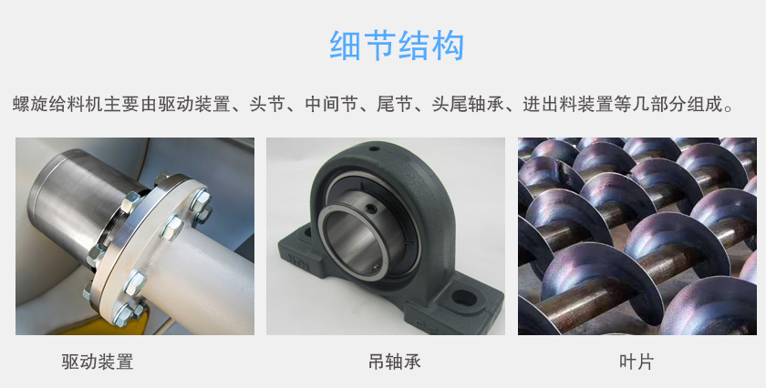 螺旋給料機(jī)主要由驅(qū)動(dòng)裝置、頭節(jié)、中間節(jié)、尾節(jié)、頭尾軸承、進(jìn)出料裝置等幾部分組成。