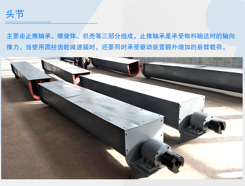 頭節(jié):主要由止推軸承、螺旋體、機(jī)殼等三部分組成,止推軸承是承受物料輸送時(shí)的軸向推力。當(dāng)使用圓柱齒輪減速箱時(shí),還要同時(shí)承受驅(qū)動(dòng)裝置額外增加的懸臂載荷。