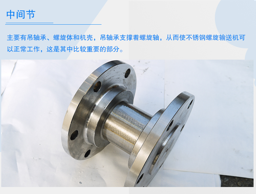 中間節(jié):主要有吊軸承、螺旋體和機(jī)殼,吊軸承支撐著螺旋軸,從而使不銹鋼螺旋輸送機(jī)可以正常工作,這是其中比較重要的部分。