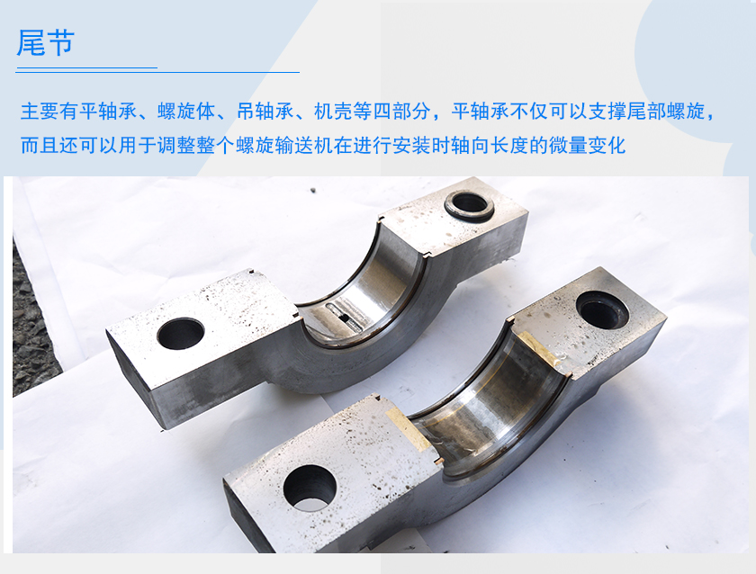 尾節(jié):主要有平軸承、螺旋體、吊軸承、機(jī)殼等四部分,平軸承不僅可以支撐尾部螺旋,而且還可以用于調(diào)整整個(gè)螺旋輸送機(jī)在進(jìn)行安裝時(shí)軸向長(zhǎng)度的微量變化。