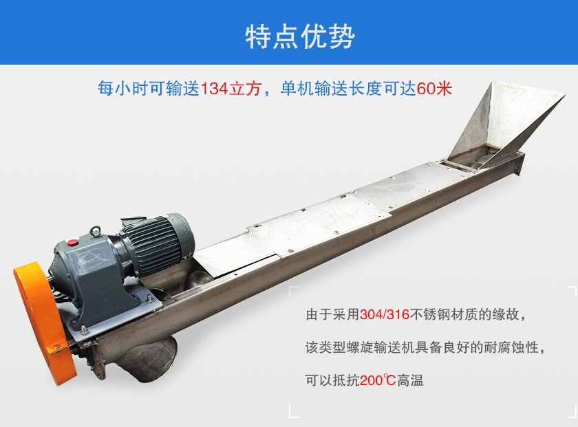 不銹鋼螺旋輸送機(jī)采用了304/316不銹鋼材質(zhì)制成,耐酸堿腐蝕、抗200℃高溫、防止機(jī)器生銹而污染到物料,所以在食品、醫(yī)藥行業(yè)使用較為廣泛,不銹鋼螺旋輸送機(jī)可以水平、傾斜、垂直輸送粉末、顆粒及小塊狀物料。