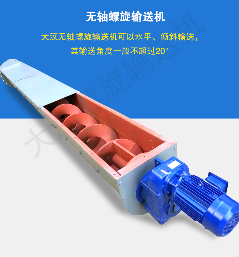 無軸螺旋輸送機主要由驅動裝置、頭部裝配、機殼、無軸螺旋體、槽體襯板、進料口、出料口、機蓋(需要時)、底座等組成。