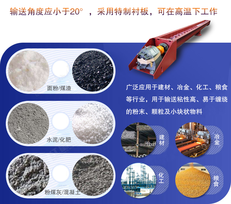 無軸螺旋輸送機廣泛應用于建材、冶金、化工、糧食等行業,用于輸送粘性高、易于纏繞的粉末、顆粒及小塊狀物料,其輸送角度應小于20°,采用特制襯板,可在高溫下工作。