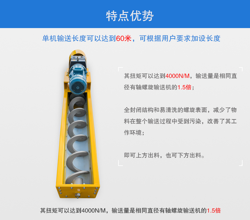 2、其扭矩可以達到4000N/m,輸送量是相同直徑有軸螺旋輸送機的1.5倍;